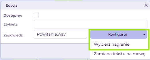 - W edycji bloczka Zapowiedź klikamy w Konfiguruj > Wybierz nagranie