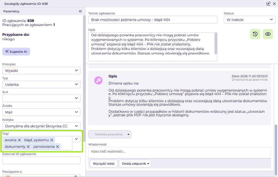 - W karcie zgłoszenia dodano pole Tagi, umożliwiające wybór z listy wcześniej zdefiniowanych tagów.