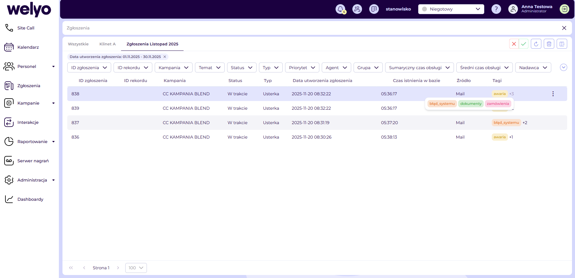 Celem aktualizacji jest wprowadzenie funkcjonalności tagowania zgłoszeń w systemie Welyo. Nowa opcja pozwala na oznaczanie zgłoszeń krótkimi etykietami tekstowymi (tagami), co ułatwia ich kategoryzację, filtrowanie oraz analizę. Tagami mogą zarządzać administratorzy, natomiast użytkownicy mogą je przypisywać bezpośrednio na kartach zgłoszeń.