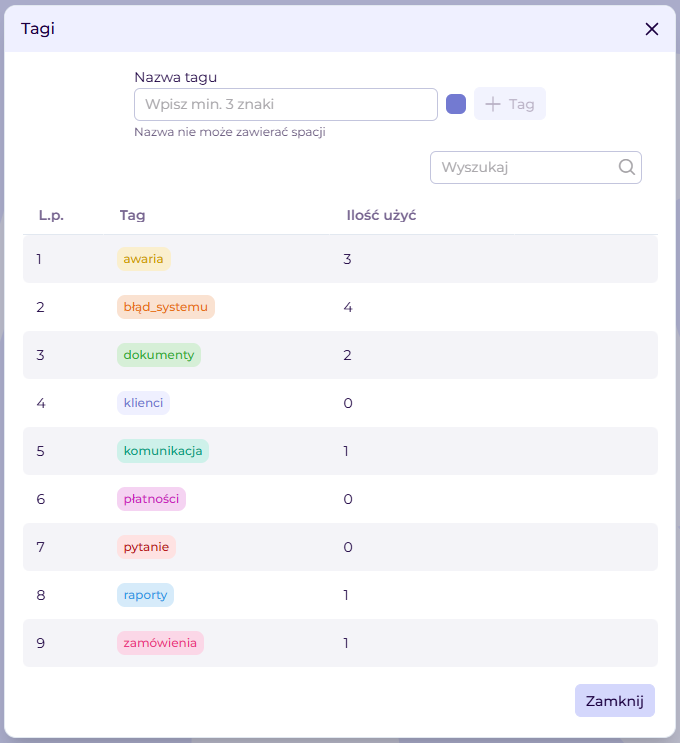 - Usunięcie tagu powoduje również usunięcie jego przypisań do zgłoszeń (operacja nieodwracalna).