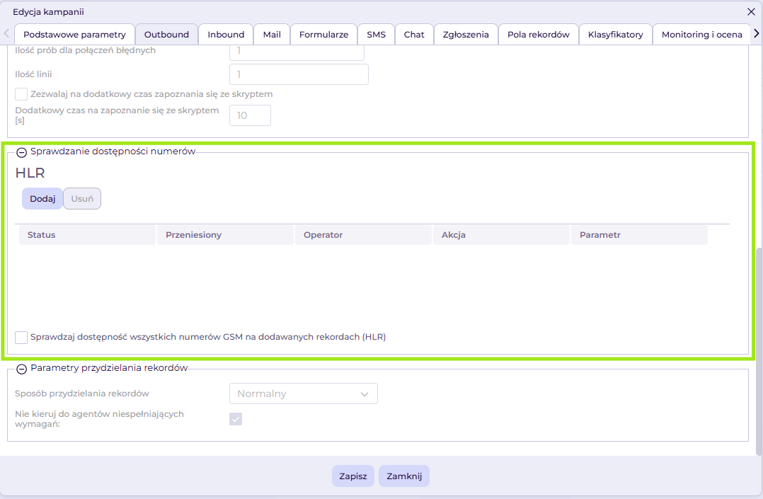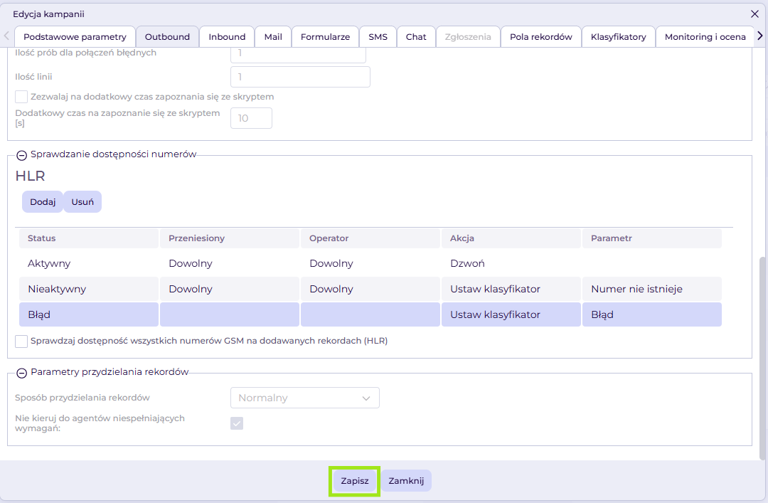 Funkcja HLR umożliwia automatyczne sprawdzanie dostępności numerów GSM przed ich wydzwonieniem w kampanii. Dzięki niej system weryfikuje, czy dany numer jest aktywny, a następnie podejmuje odpowiednie działania – np. usuwa numer, oznacza go klasyfikatorem lub przekazuje do wydzwonienia. Pozwala to ograniczyć połączenia na nieaktywne numery i zwiększyć skuteczność kampanii wychodzącej.