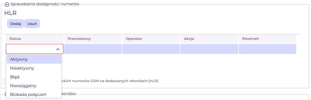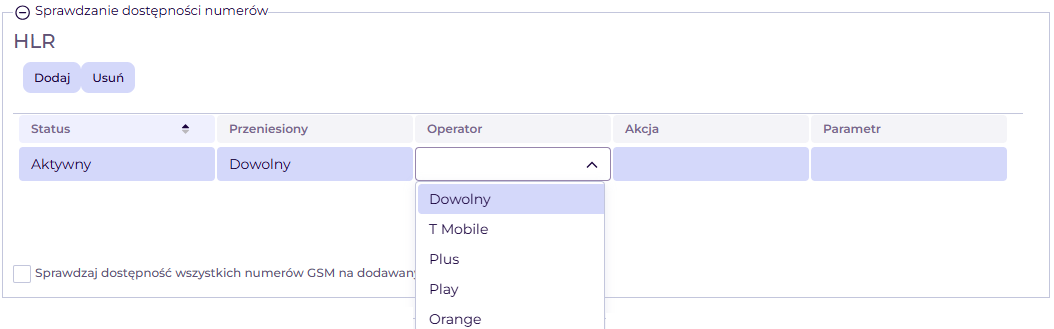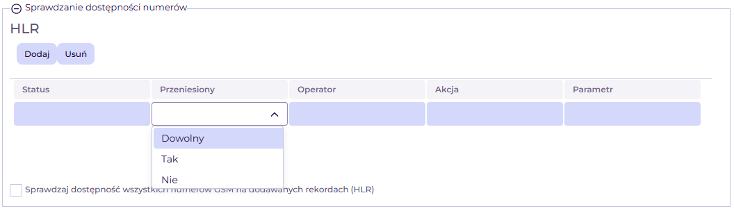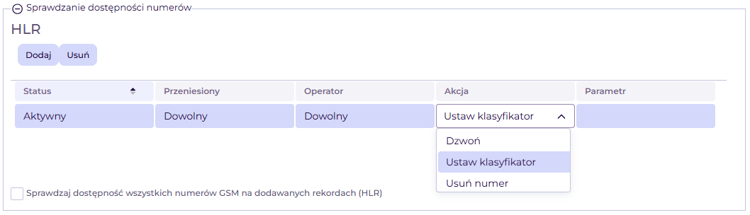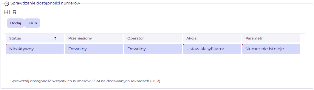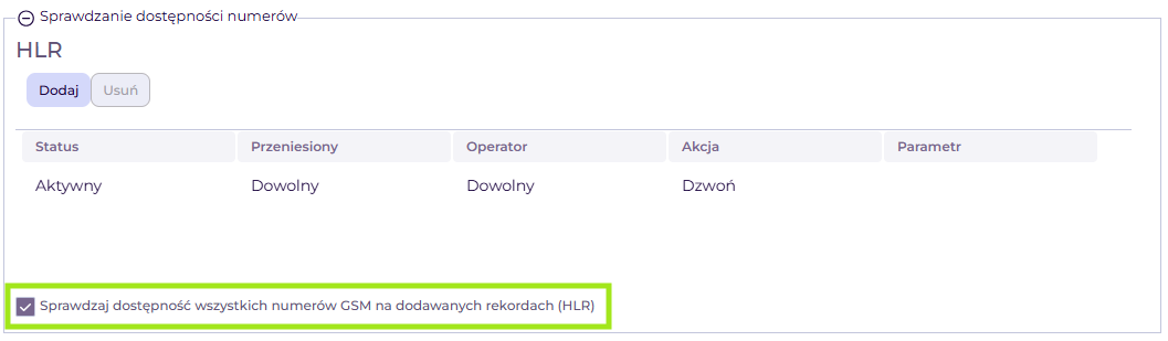 Opcja Sprawdzaj dostępność wszystkich numerów GSM dodawanych na rekordach (HLR) spowoduje, że każdy numer (dodany pojedynczo czy masowo) zostanie sprawdzony przed wydzwonieniem.