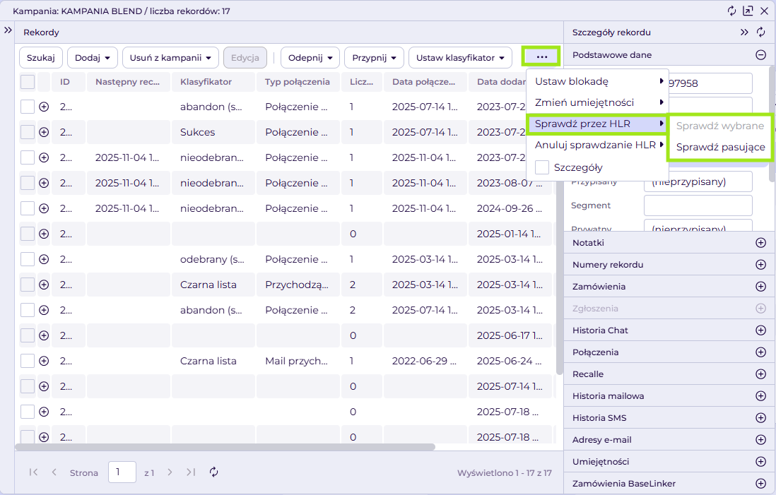 Kampanie > Kampanie > Wybrana kampania > Podgląd > Więcej > Sprawdź przez HLR > Sprawdź wybrane/pasujące