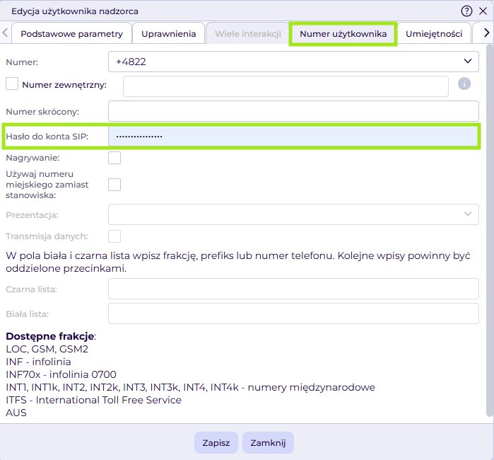 Nadanie hasła do konta SIP