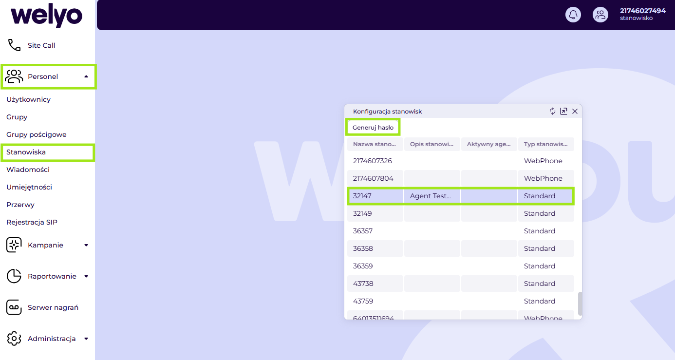 Hasło SIP jest przypisane do konta użytkownika powiązanego z numerem miejskim lub stanowiskiem pięciocyfrowym i stanowi kluczowy element konfiguracji połączeń między urządzeniem (np. telefonem IP lub softphone’em) a platformą Welyo.