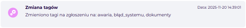 ℹ️ Każda zmiana tagów odkładana jest w historii zgłoszenia w formie wpisu o tytule Zmiana tagów.