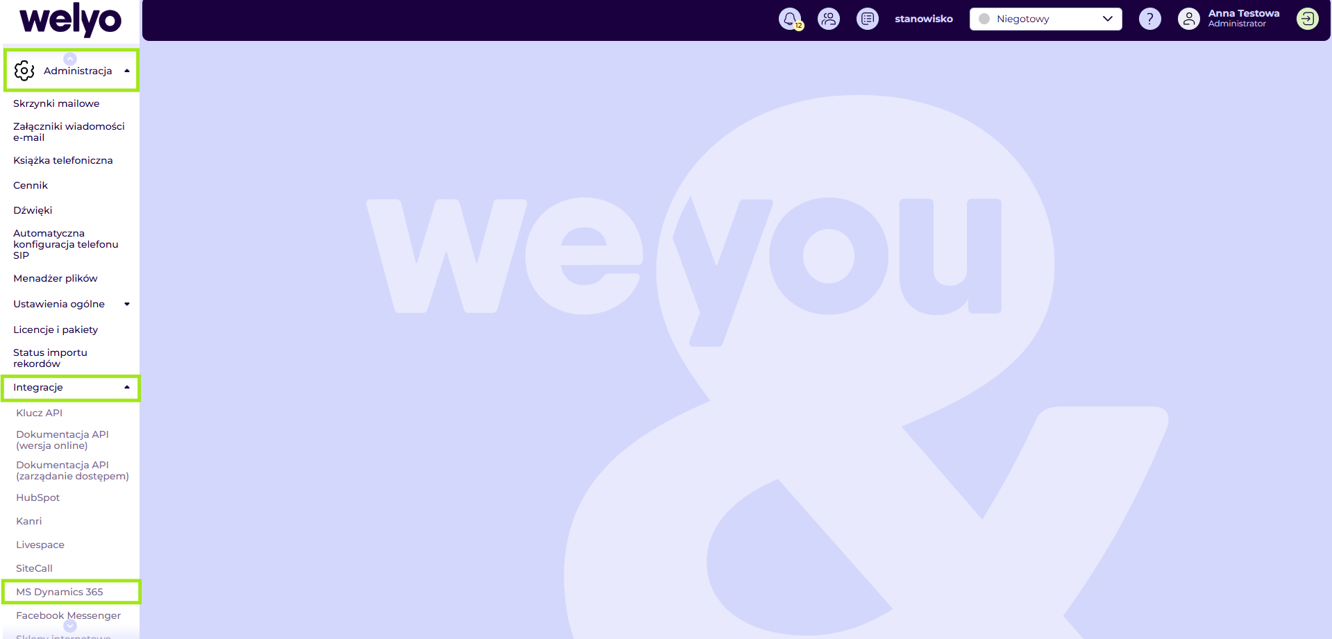 Aby zapewnić poprawną, dwukierunkową komunikację między systemami, konieczne jest wykonanie dodatkowej konfiguracji po stronie platformy Welyo . W tym celu należy zalogować się do panelu Administratora , a następnie przejść ścieżkę: