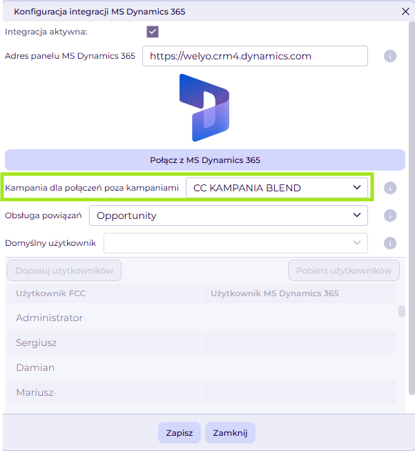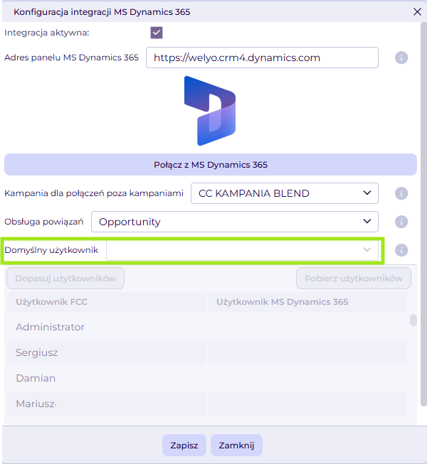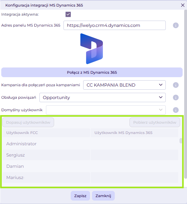 Ostatnim krokiem jest uzupełnienie tabeli z mapowaniem użytkowników FCC na użytkowników MS Dynamics. W kolumnie Użytkownik MS Dynamics 365 wybieramy z listy tego użytkownika, którego chcemy powiązać z odpowiednim kontem użytkownika FCC (kontem na platformie Welyo).