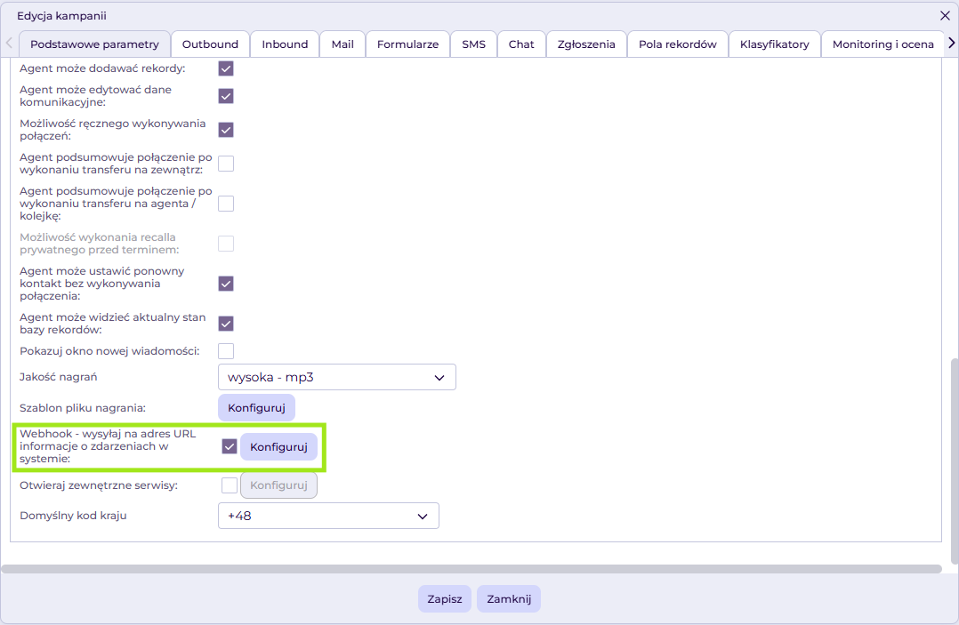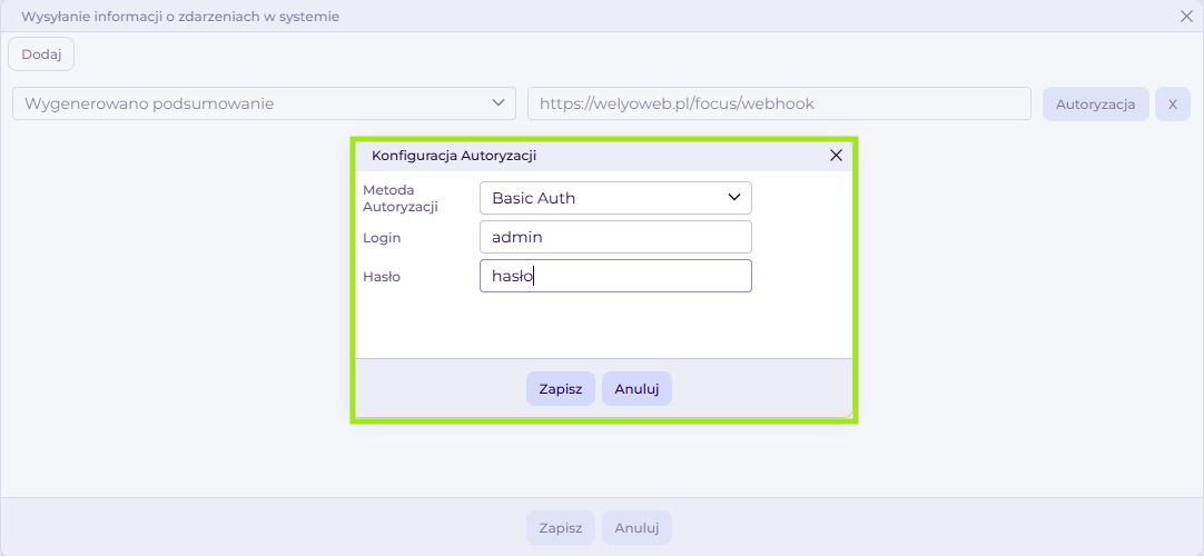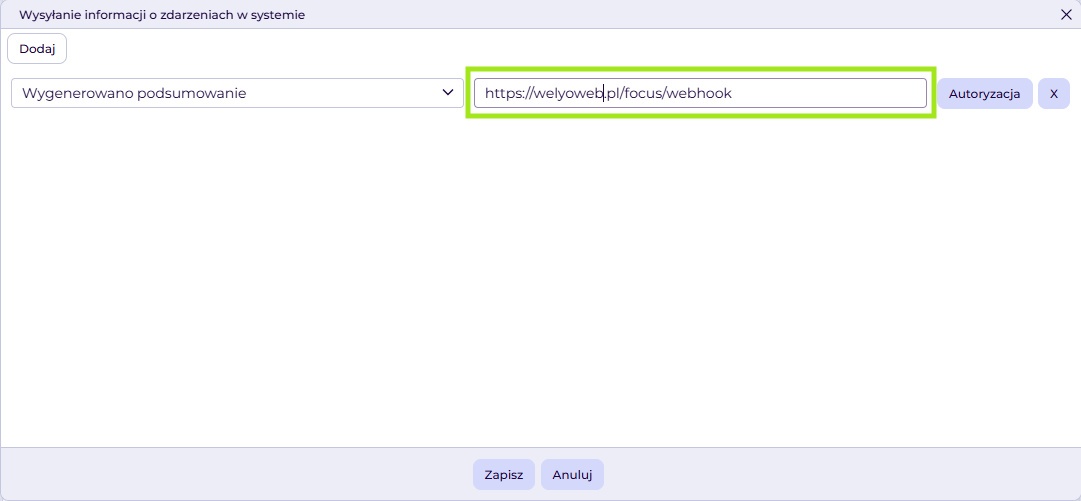 „Webhook – wysyłaj na adres URL informacje o zdarzeniach w systemie:”
