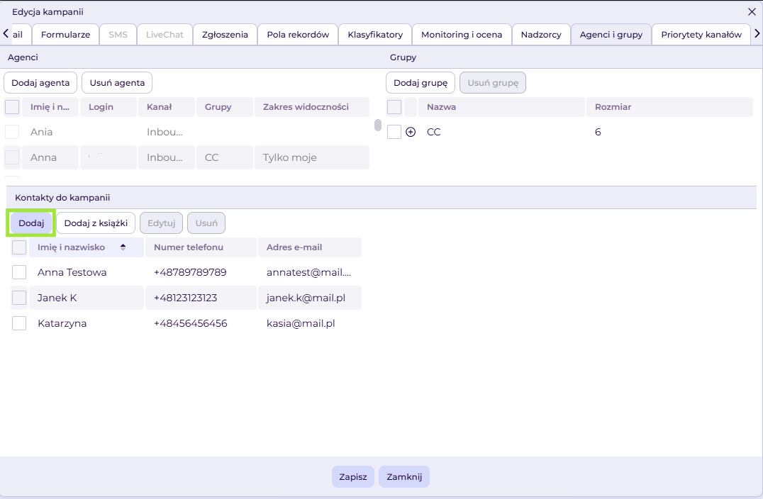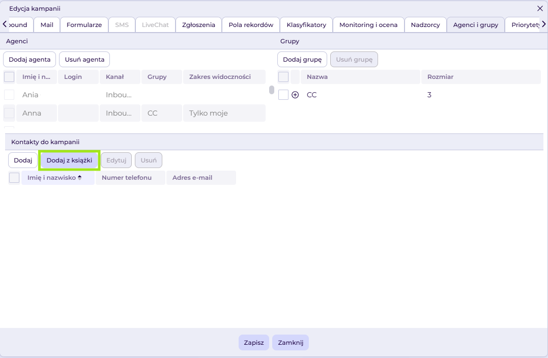 Konfiguracja książki telefonicznej w kampanii umożliwia Administratorowi dodawanie kontaktów (z książki lub pojedynczych) do wybranej kampanii, dzięki czemu agenci pracujący w tej kampanii będą mieli do nich dostęp.