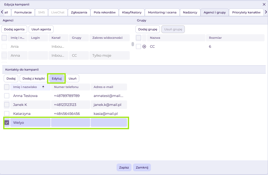 Edycja pojedynczych kontaktów do kampanii