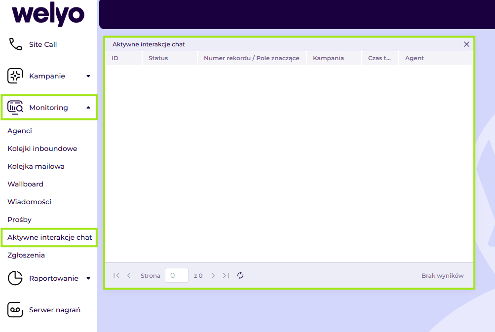 Aby przejść do monitorowania interakcji czatowych agentów, w panelu nadzorcy przejdź do Monitoring > Aktywne interakcje czat. W wyświetlonym oknie nadzorca może monitorować pracę agentów, którzy aktualnie mają nawiązaną interakcję czat.