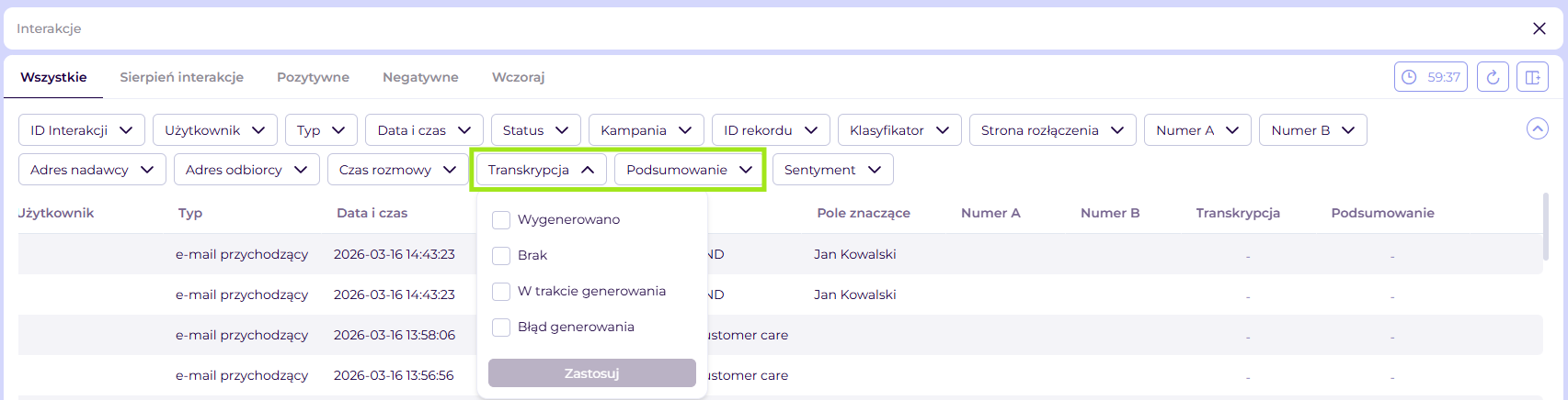 Widok Interakcje - filtr na Transkrypcje i podsumowania