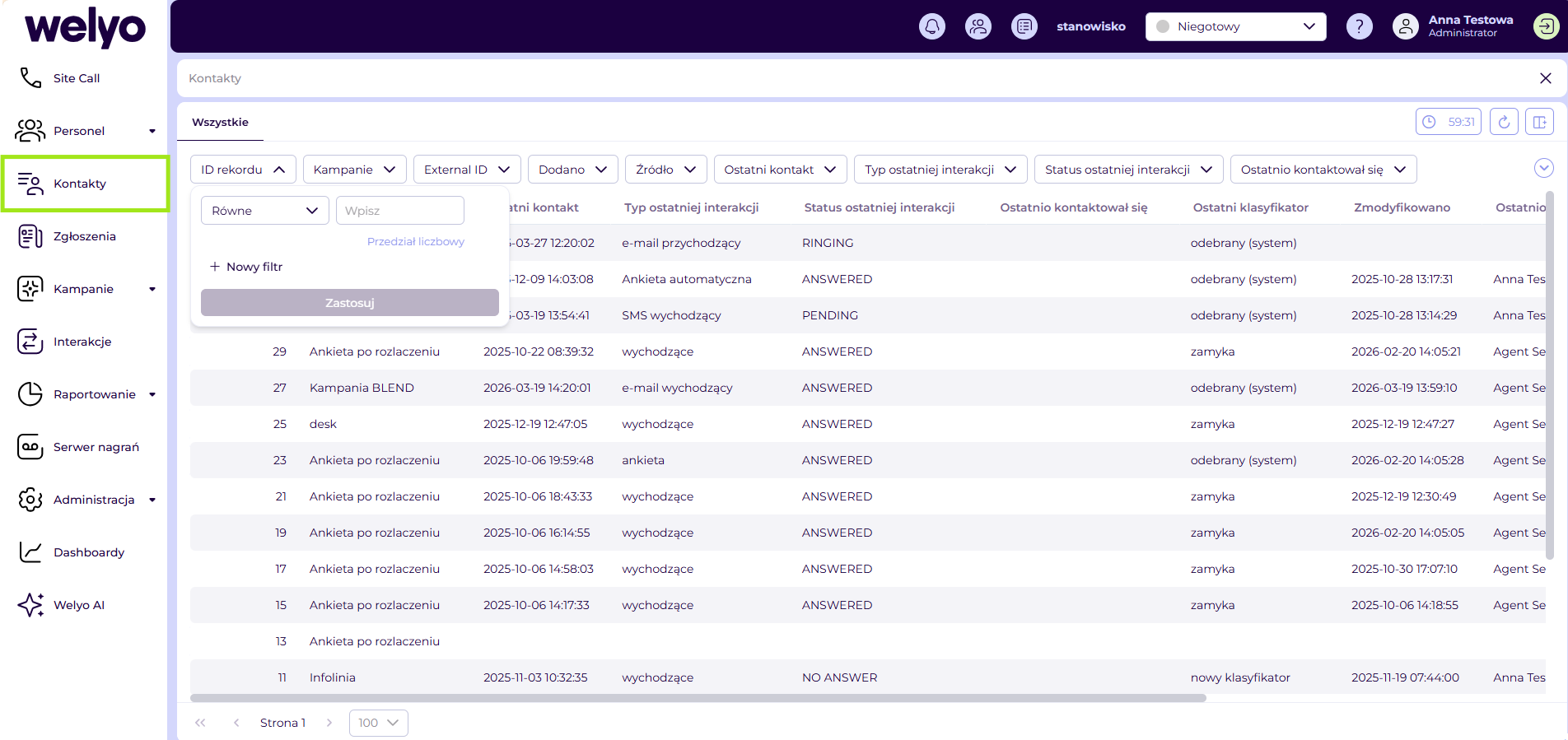 Zmiana dotyczy rozbudowy widoku Kontakty o nowe pola filtrowania, obsługi wielu warunków w filtrach tekstowych i liczbowych oraz rozszerzenia odpowiedzi API fcc-export-calls o dane zgłoszeń dla kampanii desk.