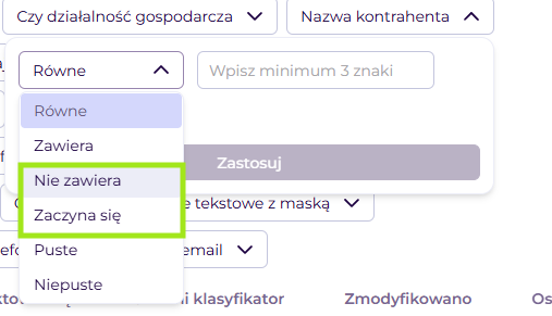 - zaczyna się — wyszukuje rekordy, w których treść pola zaczyna się od wskazanej frazy.