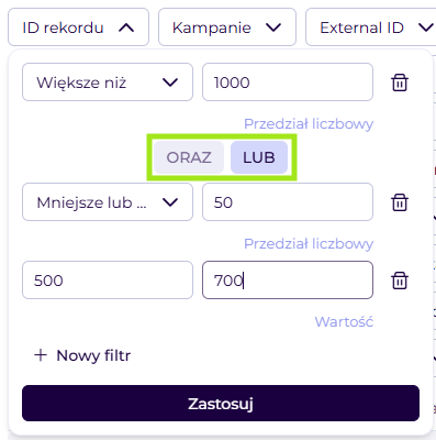 Wybrany spójnik obowiązuje dla wszystkich warunków zdefiniowanych w ramach danego pola. Usunięcie pojedynczego warunku jest możliwe z poziomu ikony kosza. Zdefiniowane filtry są również zapisywane podczas tworzenia własnych widoków.