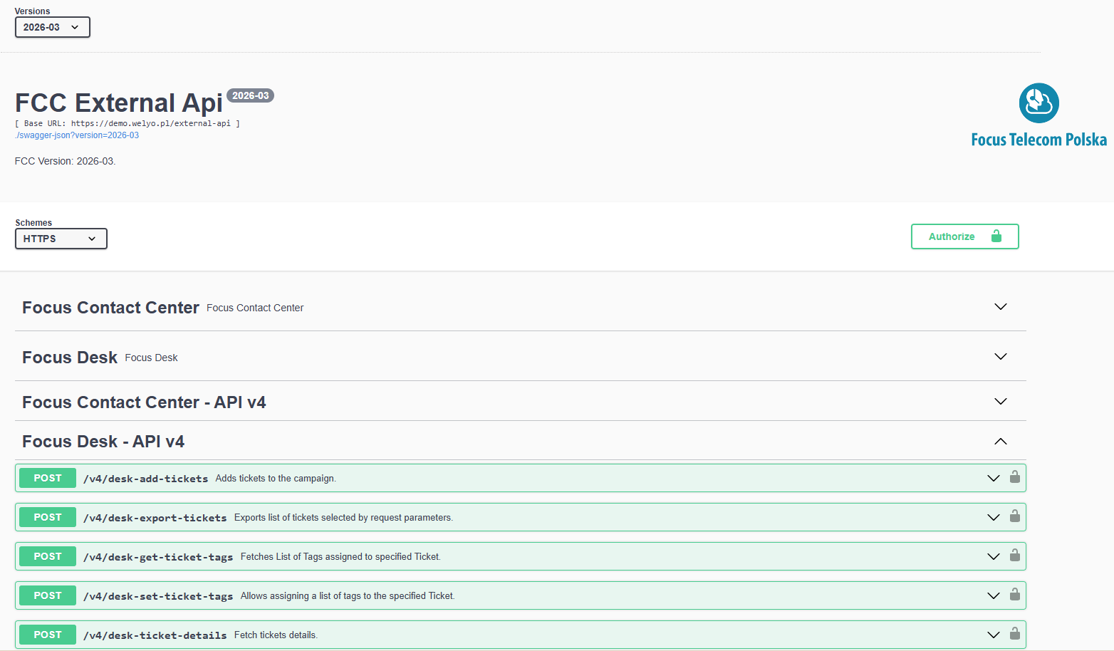 - Focus Desk – API v4 – dla platform z aktywną Bazą Rekordów (miniCRM) oraz kampaniami wykorzystującymi kanał zgłoszeniowy.